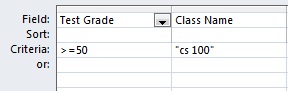 To specify a Query you need to let Access know what you are interested in querying. You have done this once before in the Queries using a Filter but say you want to see all the students who have a test grade over 75%, you would change the Field to "Test Grade", then enter ">=75" in the Criteria cell under "Test Grade"