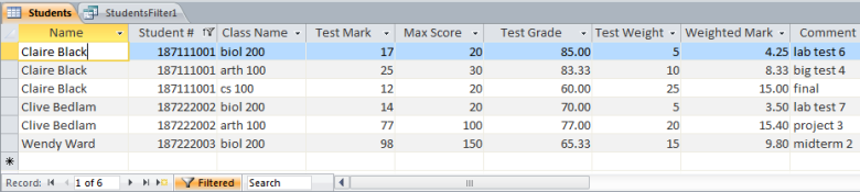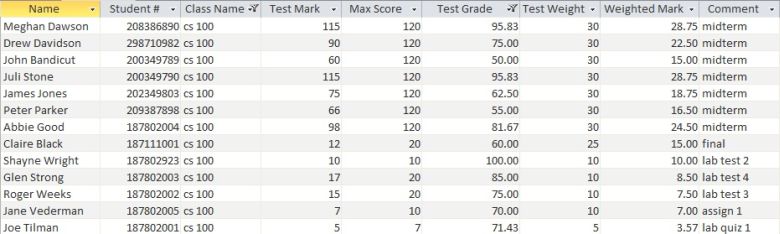When you apply the query, you will see the CS100 students who have passed. Only those records matching the two criteria, that is, a CS100 student, and a student who passed, are displayed.