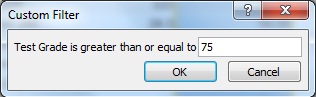 Lets try another more real world example. Say you want to see all the students who have a test grade over 75%, you would select the Field "Test Grade", Then select the filter button and then select the Number filters and select Greater Than
